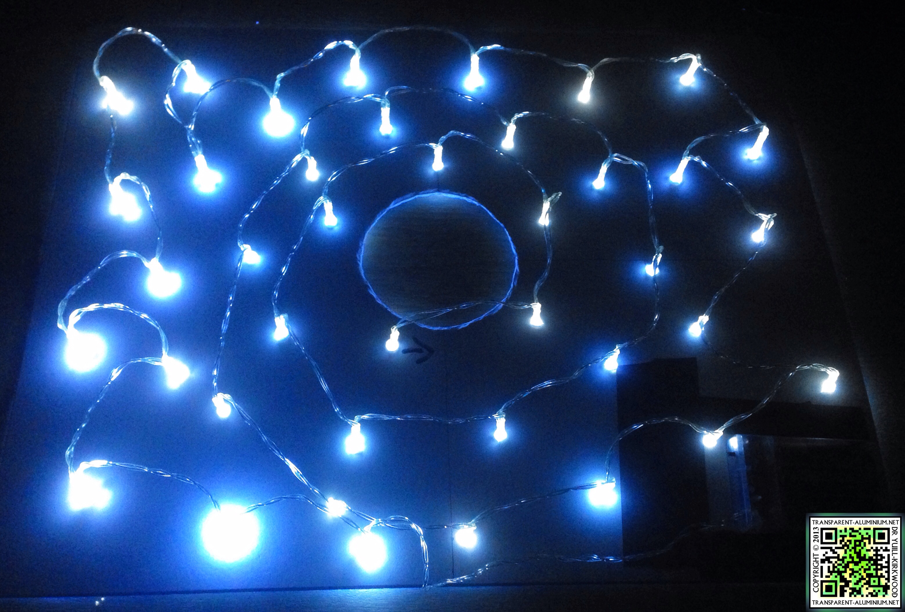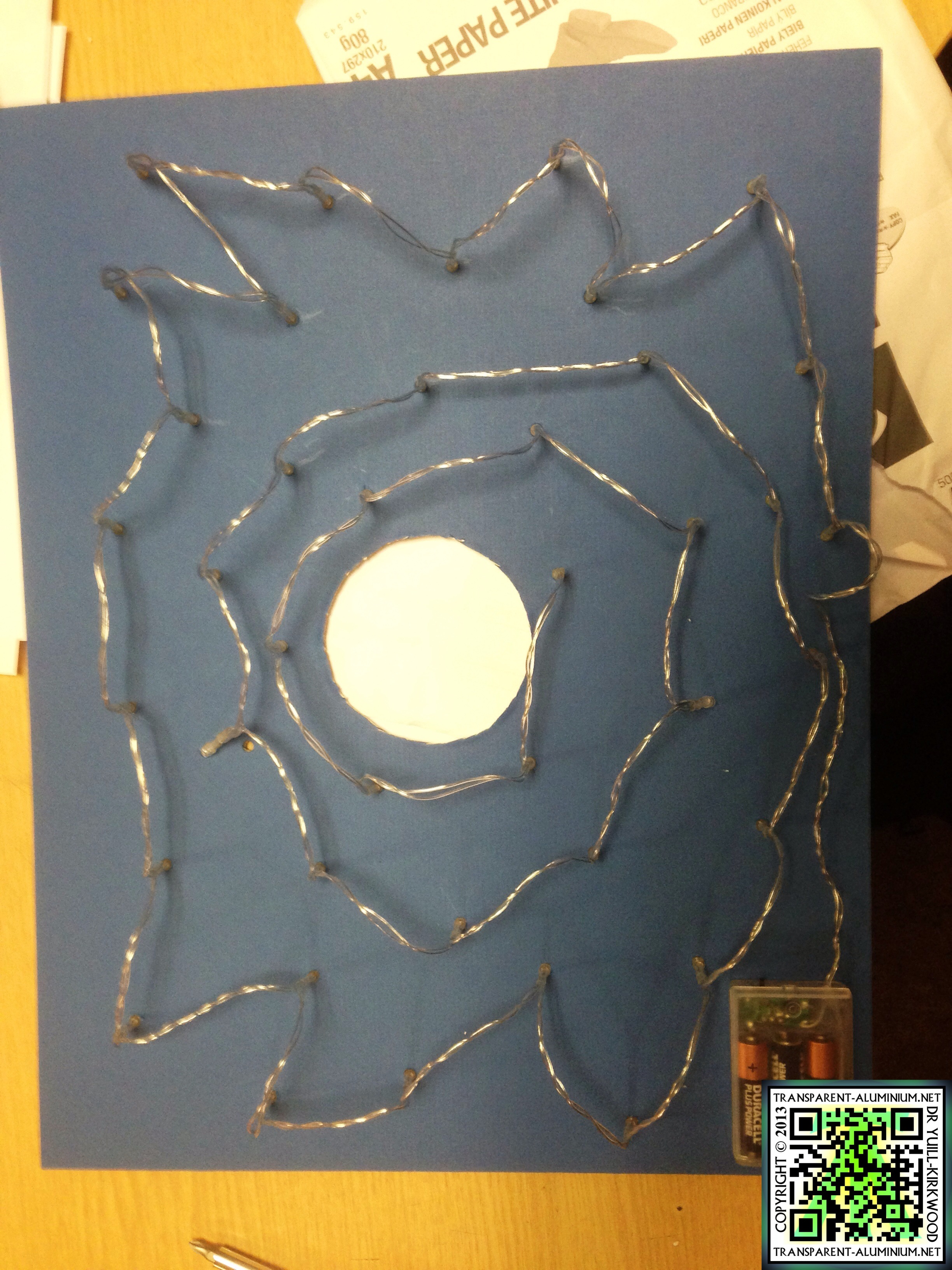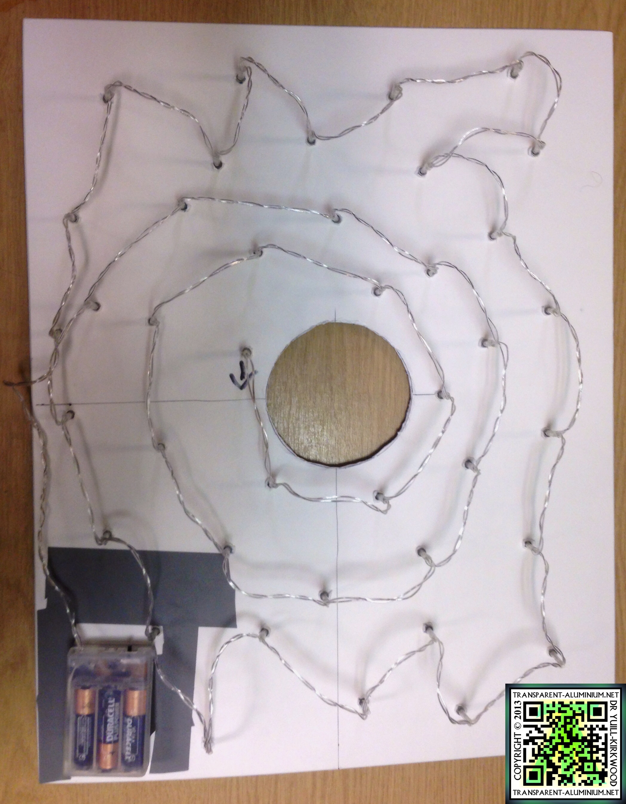 Once you have the first whole push the LED in from the front, then using the next LED move it to the next point where you want it to be and drill the next one and push the LED in. Repeat this until you have all the bulbs in filling up all the space, you can see the patter I followed above, I also left a space for the battery pack to be attached. You may notice as you go that like in my set that not all the LED’s have the same length of wire between them. This is why I did not mark off a set of holes and drill them out in one go instead I marked and drilled out one LED at a time to make sure they would all fit.